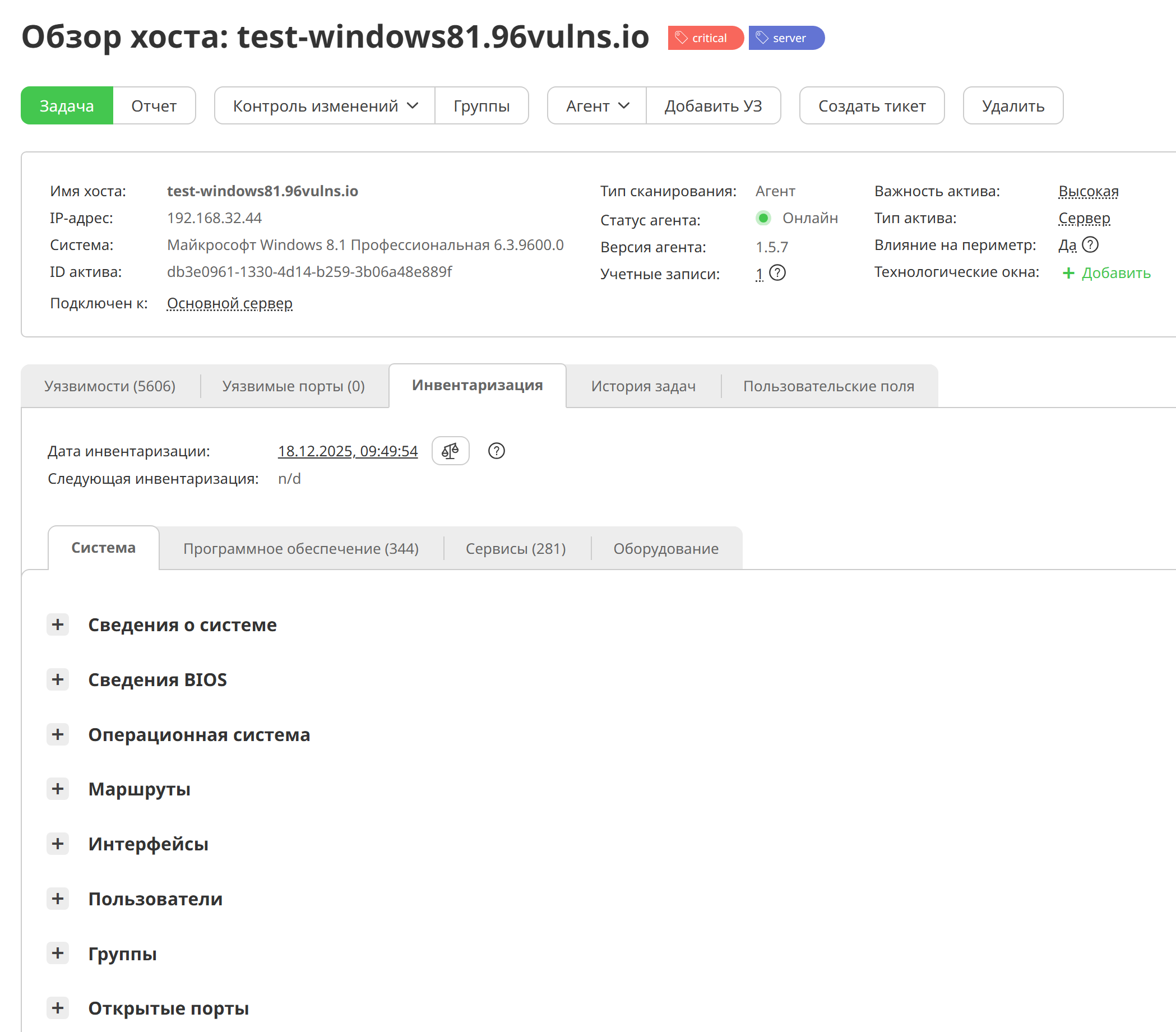 Сбор расширенной информации об активах: настройки ОС, данные BIOS, сетевые конфигурации, пользователи и группы, открытые порты, установленное ПО, сервисы и службы, аппаратная конфигурация