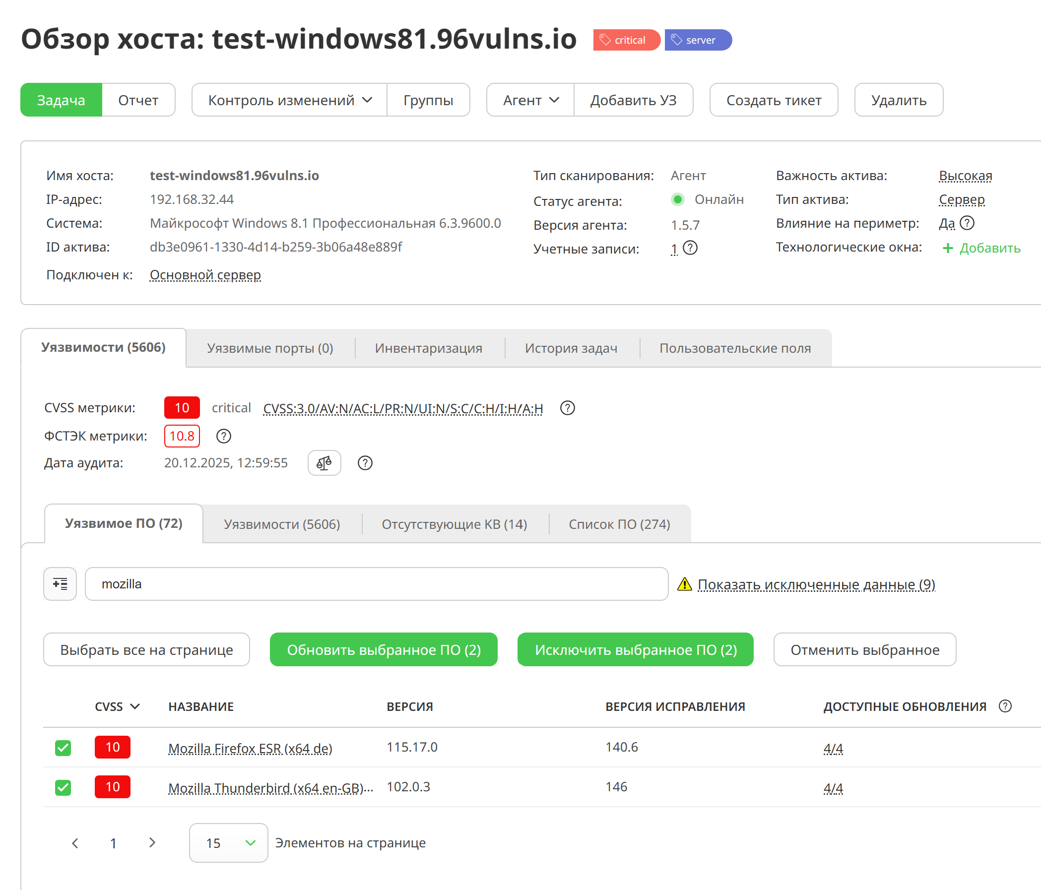 Обновление уязвимого ПО в режиме «единого окна» - прямо из результатов аудита, рекомендации по компенсирующим мерам, добавление уязвимостей в списки исключений, создание заявок на устранение уязвимостей