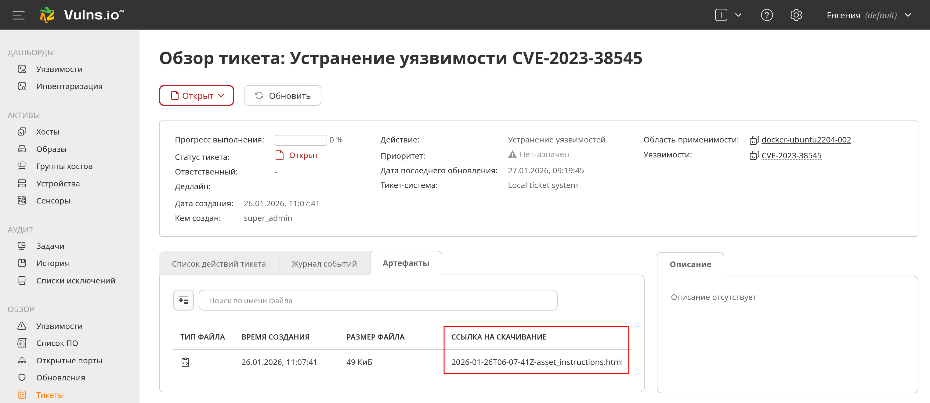 - генерация инструкции по устранению уязвимостей при создании тикета и автоматическая отправка инструкции во внешнюю тикет-систему.