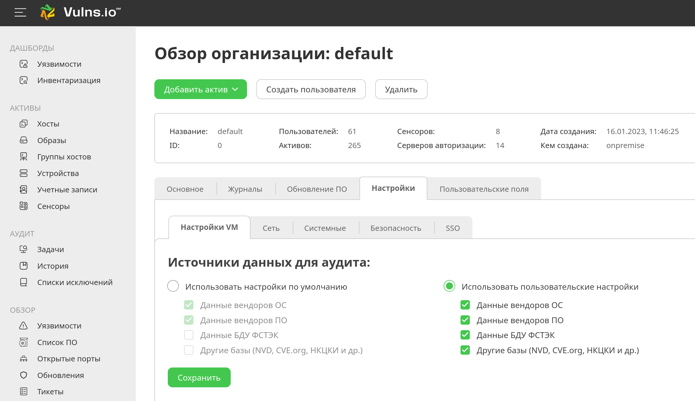 Появилась возможность использовать сторонние БДУ для сканирования уязвимостей (beta). В карточке организации можно выбрать, при помощи каких БДУ будет производиться анализ отсканированных данных.