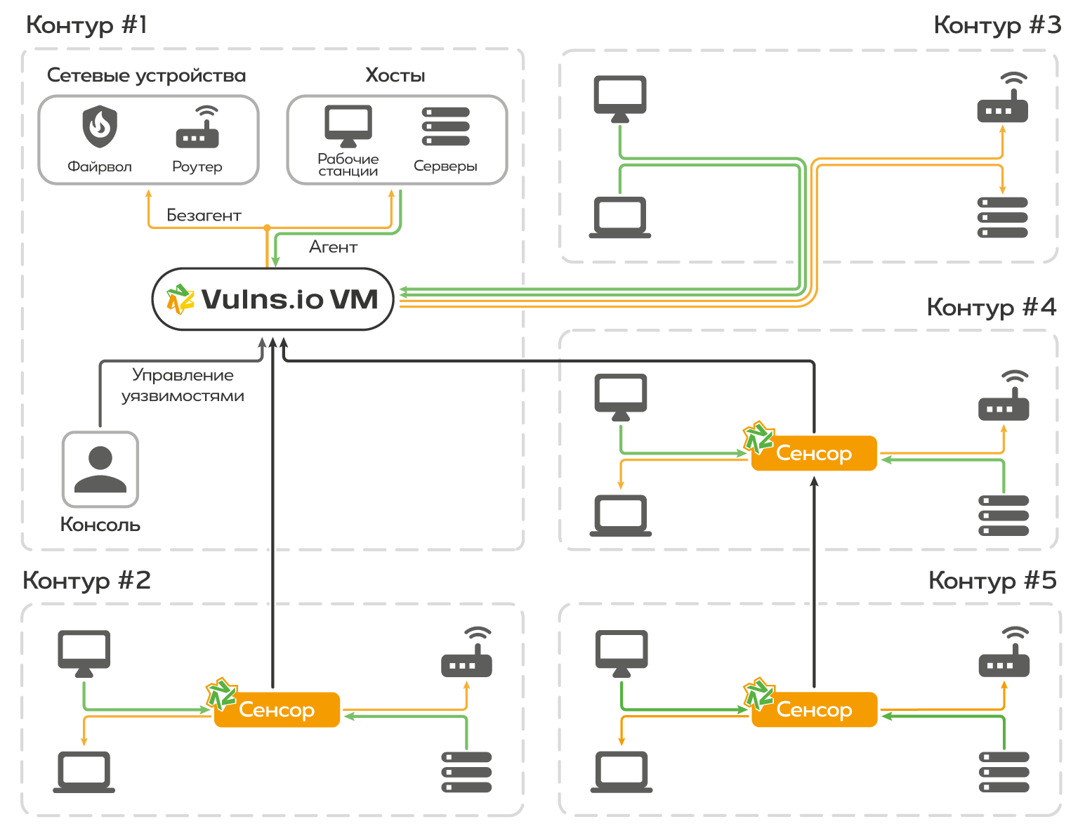 В новой версии реализована работа с Сенсором. Это отдельный модуль, который подключается к основному серверу с установленной Системой или другому Сенсору, и обеспечивает связь с активами в удаленном или изолированном сегменте. Технология проксирования соединения решает вопрос для распределенной инфраструктуры.