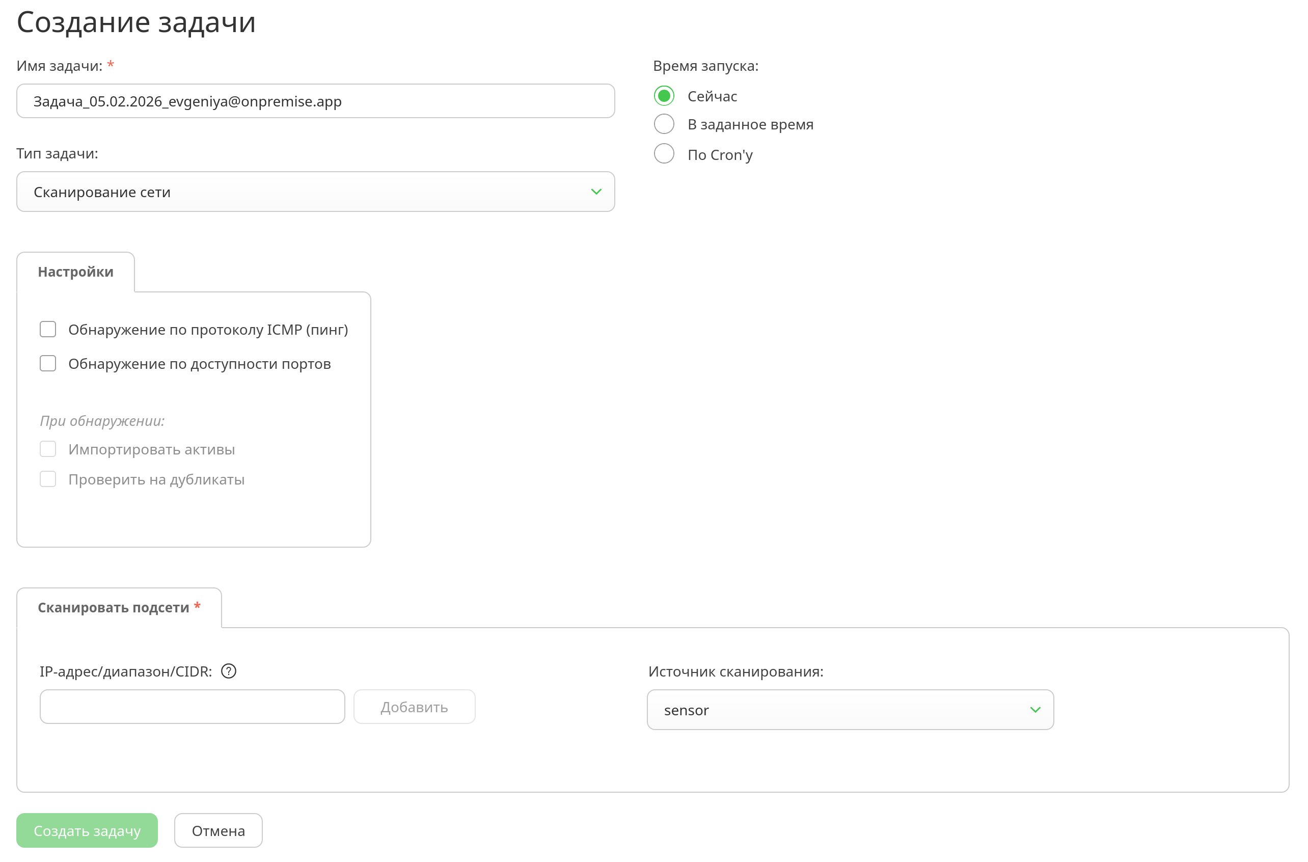 Кроме того, появилась возможность проводить сканирование сети (discovery) на Сенсорах. Теперь, помимо взаимодействия с активами напрямую (агентно или безагентно), можно проводить сканирование сетей с распределенной инфраструктурой через модуль Сенсор, получать информацию об активах в удаленном или изолированном сегменте и уже в дальнейшем с ними работать.